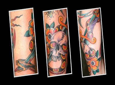 Finally, I got my outer elbow to forearm done with a snake coiling through a skull and dagger and impaling itself on the dagger’s blade.